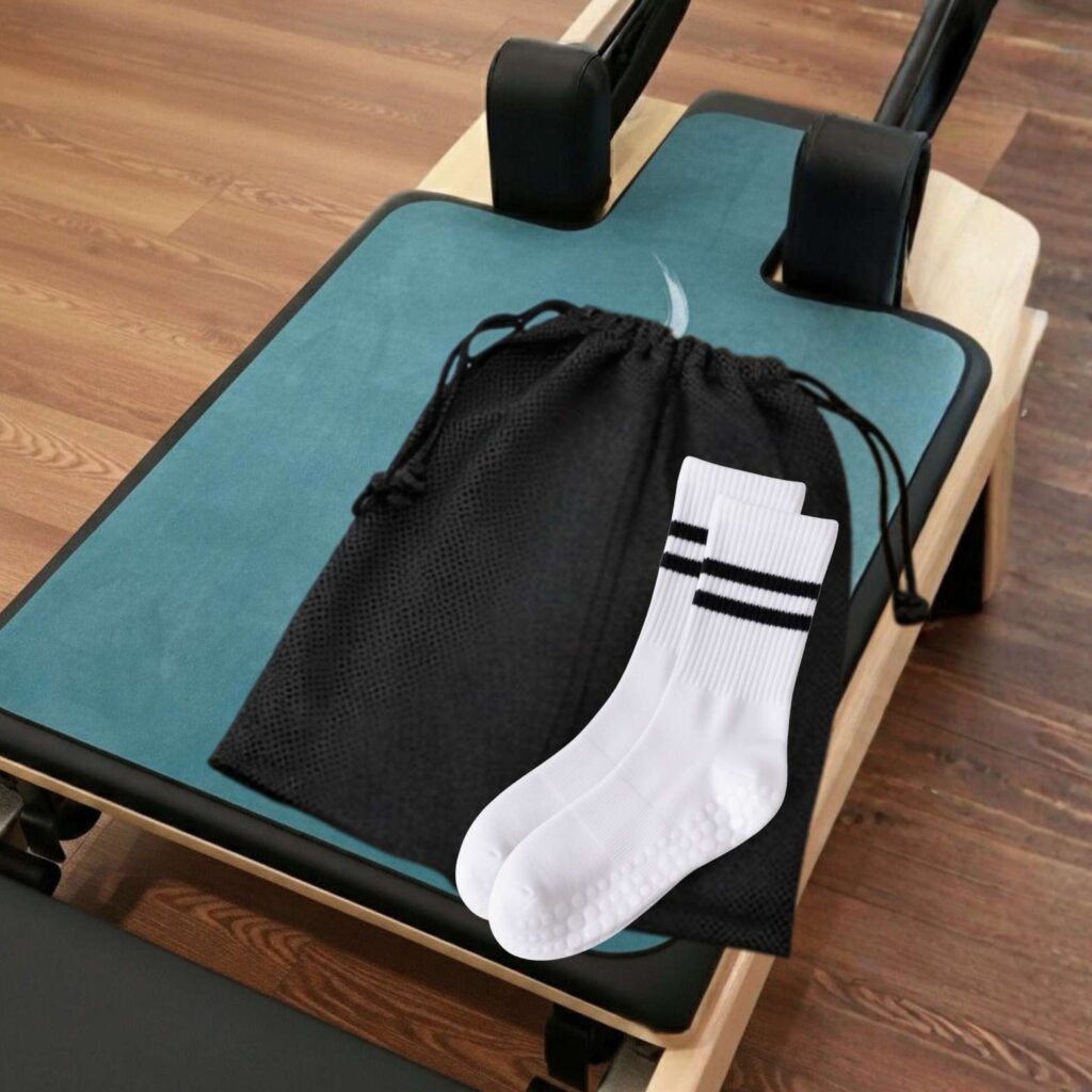 Included grip socks and carry bag guarantee stability and comfort, allowing you to focus fully on your Pilates flow.