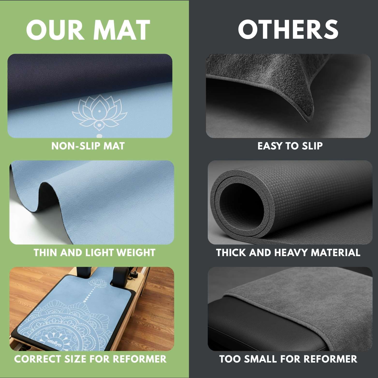Your pilates mat should work for you—not create distractions. This Atellya design protects the carriage, supports your hands and feet, and gives you the clean, personal space you deserve. For those searching for durable non slip reformer pilates mat, this set checks every box.